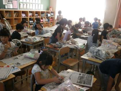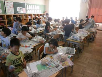2年生は、図工の作品づくりのために、新聞紙をまるめていました。