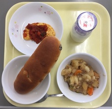 レーズンロールパン 牛乳 じゃがいものバター煮 オムレツトマトソースかけ