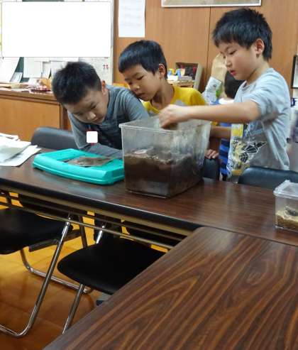 校長室にいるオオクワガタを、たくさんの子が見にきました。
