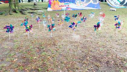 春日井まつりの野外造形展で、2年生の力作「キラキラかがやくお花のマーチ」が展示されました。