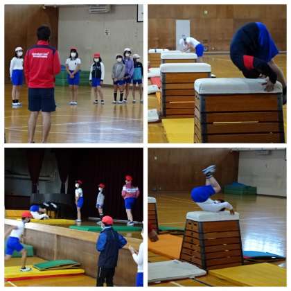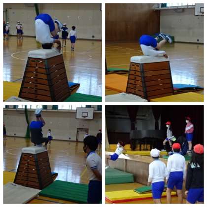 5年生は体育の授業でとび箱に挑戦しました。今日は台上前転の練習をしました。不安のある人はステージ上のマットで前転をして、台上前転の感覚をつかんでいました。