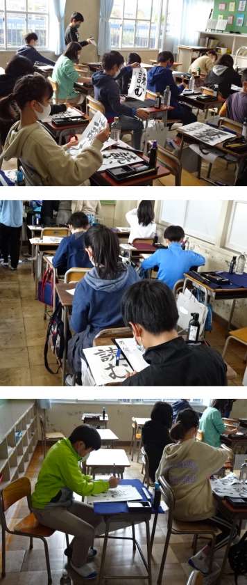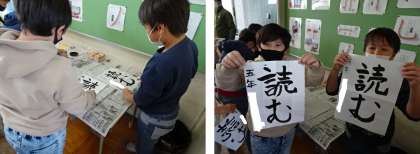 5年生は、書の時間に毛筆の練習をしました。今日は「読む」という文字でした。書いた作品には、最後に印を押して完成です。