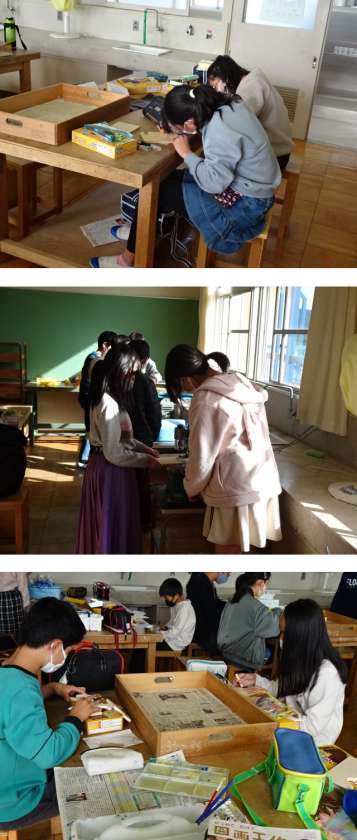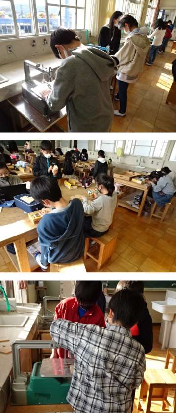 6年生は図工の授業で、テープカッターづくりに挑戦しています。板にデザインを描き、糸のこ盤でまわりを切った後、デザインに合わせて、彫刻刀などでけずったり、絵の具で塗ったりする作業を行いました。