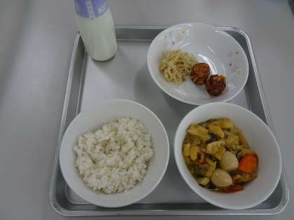 本日の給食のメニューは、麦ご飯・牛乳・中華海鮮旨煮・揚げしゅうまい・もやしナムルです。