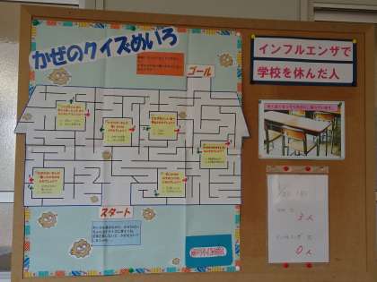 保健室の掲示板で、かぜやインフルエンザによる欠席者数がわかるようになっています。また、風邪をひかないようにと楽しい迷路を使った掲示物も貼られています。