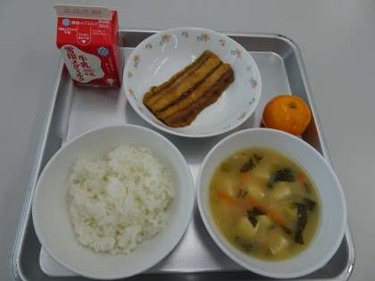 本日の給食のメニューは、ご飯・牛乳・白味噌汁・さんまのかば焼き・冷凍みかんです。