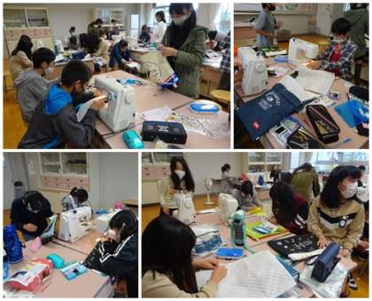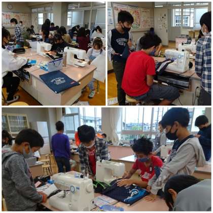 家庭科では、ミシンを使ってナップサックを縫っていました。