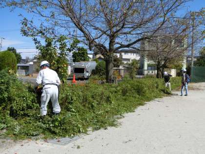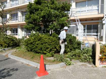 前回に続いて、正門付近や花壇の樹木を剪定していただきました。枯れていた木や伸びすぎた木もすっきりしました。
