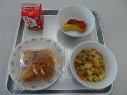 本日の給食のメニューは、りんごパン・牛乳・じゃが芋のバター煮・オムレツのトマトソースかけです。