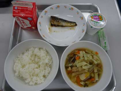 本日の給食のメニューは、ご飯・牛乳・サボテンきしめん汁・いわしの生姜煮・愛知のみかんゼリーです。