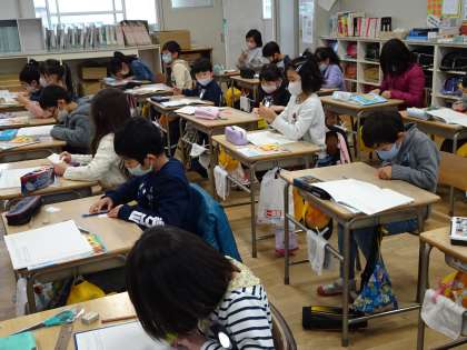 算数では、分数で半分の大きさを体感するために、折り紙を使って切り取る学習をしていました。