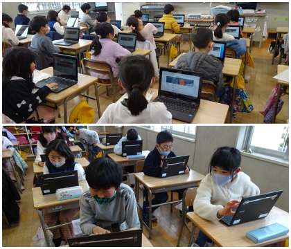 タブレットを使って、クラスで意見交換をするために、振り返りの文章を書けるように練習していました。