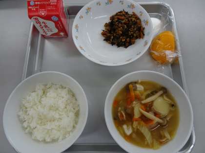 本日の給食のメニューは、ご飯・牛乳・九州の郷土料理 だご汁・肉みそひじき丼・しらぬいです。