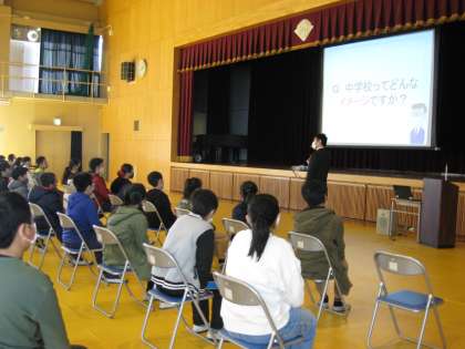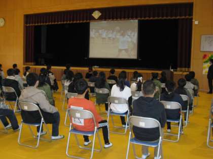 6年生のために、中学校から先生方が来てくださいました。中学校生活について、体育館で話を聞いています。