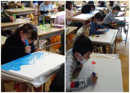 図工の作品入れに、絵を描いていました。作品ケースに思い出の作品を入れて持ち帰ります。