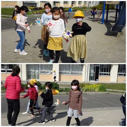 図工で作った風車を校庭で、まわしていました。よくまわるととてもうれしそうにしていました。