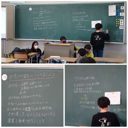 社会では、グループごとに発表したい環境問題について授業を行っていました。黒板を使って、内容をまとめていました。聞いている子ども達も、メモを取って静かに聞いていました。