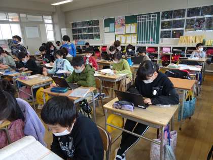 算数では、学習した内容の問題を解いていました。早く終わった子ども達は、タブレットでローマ字でキーボードを打つ練習をしていました。