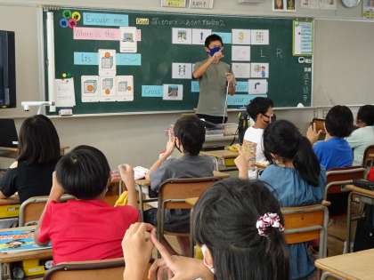 外国語科では、探し物がどこにあるか尋ねるために、右・左などの発音を学習していました。