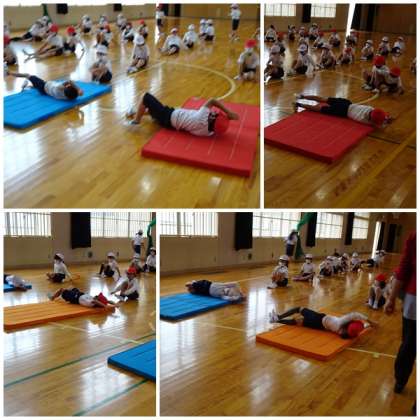体育では、マット運動をしていました。お芋のようにごろごろ横に転がる練習をしていました。