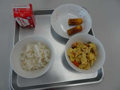 本日の給食のメニューは、麦ご飯・牛乳・高野豆腐の卵とじ・ちくわのもみじ揚げです。