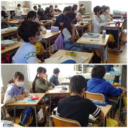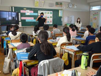 外国語科では、「生物がどこで暮らし、何を食べているかを尋ね合おう」というめあてで、場所の名前、動物の名前をキーセンテンスに当てはめて学習していました。