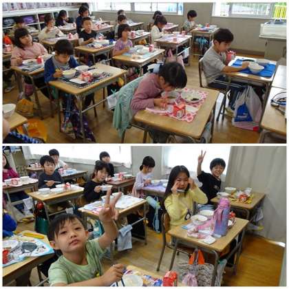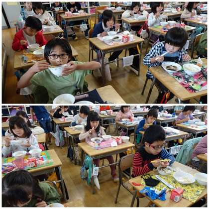 2年生の給食にお邪魔しました。静かに放送を聞きながら、もりもり食べていました。