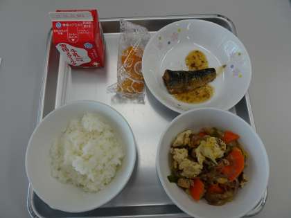 本日の給食のメニューは、ご飯・牛乳・ひきずり・イワシの生姜煮・冷凍アプリコットです。