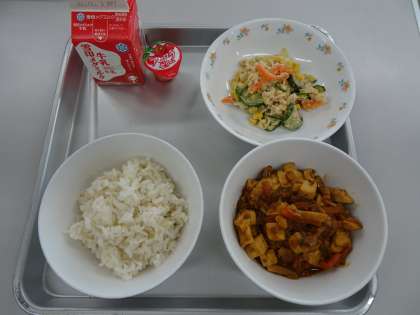 本日の給食のメニューは、麦ご飯・牛乳・麻婆豆腐・バンバンジーサラダ・ミニアセロラゼリーです。