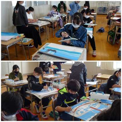 図工では、読書感想画を描いていました。色を塗るだけでなく、スパッタリングに挑戦している子もいました。まもなく完成しそうです。