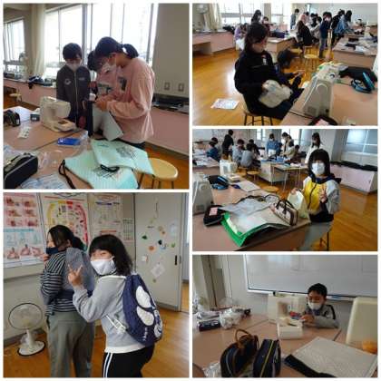 家庭科では、ナップサックの製作をしていました。完成して、背負っている子もいました。いろいろな場面で活用してください。
