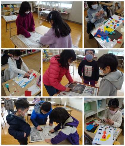 図工では、紙版画を作ったり、早くできた子はバレンでこすって半紙に写し取っていました。