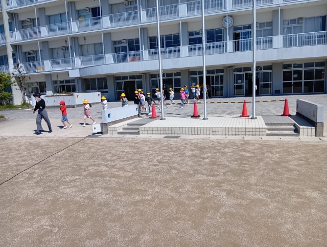 進級して生活の場が変わった子どもたちにとって、いざという時にどの階段を使い、どこを通って運動場へ向かうのかを確認することは、何よりも大切な学習です。