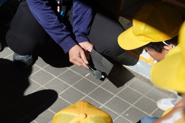 虫眼鏡を使い、太陽の光を画用紙などの上に集めます。光が集まった部分を、虫眼鏡を動かして小さくしたり、大きくしたりすると、明るさや暖かさがどのように変わるのかを調べました。