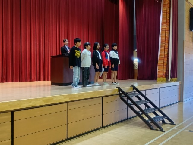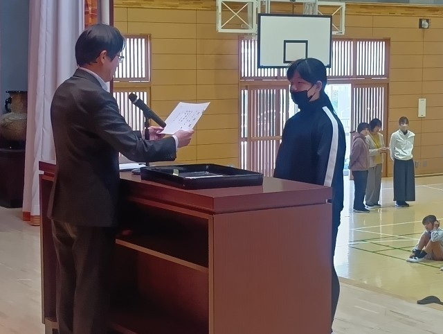 表彰に続き、後期学級委員、体育委員長、後期執行役員の認証式を行いました。様々な場面で活躍してくれることを期待しています。