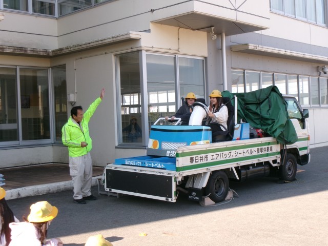 春日井警察と市民安全課を招き、交通安全教室を行いました。全体で横断歩道の渡り方を教わった後、学年ごとに分かれてトラックや自動車からの死角の話を聞いたり、自転車の安全な乗り方、シートベルト衝突体験などを行ったりしました。