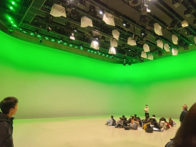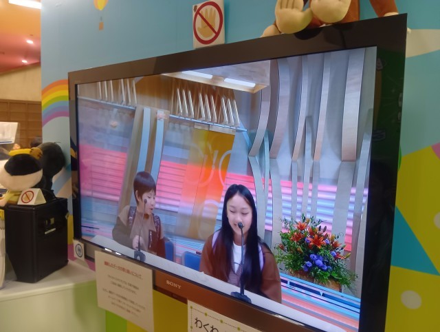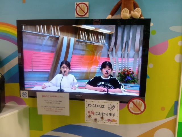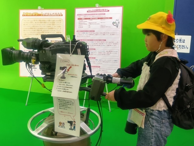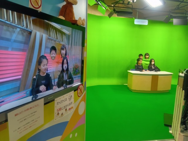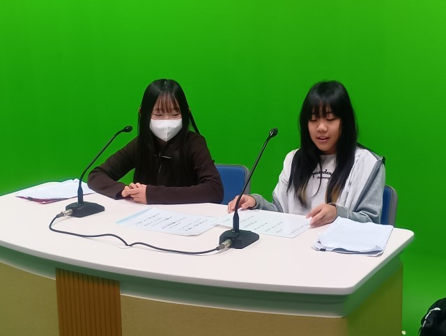 特に盛り上がったのは「キャスター体験」です。 キャスター体験では、原稿読みに挑戦!カメラの前に座ってみると、目線の先に原稿が見えて、下を向かなくてもカメラ目線で原稿を読める工夫がありました。またテレビで見てみると、キャスターが座っている背景には、花や小道具が置いてありますが、実際には緑色の壁しかなく、背景が合成されているものだと知り、とても驚いていました。スタジオ見学では、多くの機材やセット、スタジオの広さに圧倒されました。テレビ番組制作の裏側を学び、貴重な経験となりました。