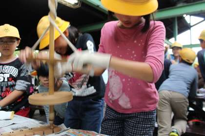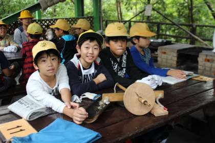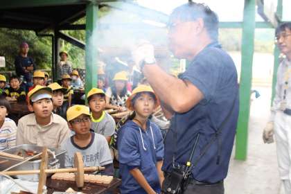 火おこしの説明をうけました。今度はみんなの番ですね。