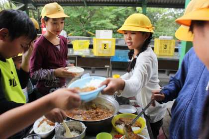 いよいよ「カレーライス」ができあがりました。配膳の準備をして班ごとに「いただきます」