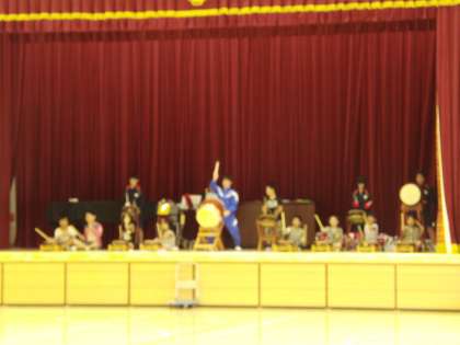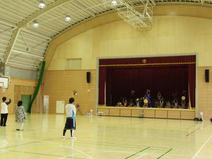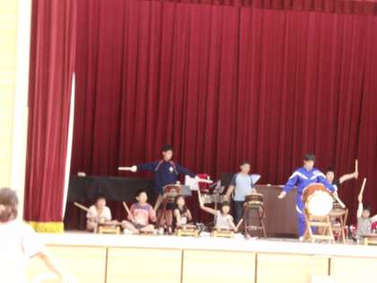 5、6、7組のみなさん、は藤中のみなさんと一緒に体育館で和太鼓の練習をしました。藤中の文化祭で一緒に演技をする予定です。そのために今日は体育館の舞台の上で練習しました。ポーズも決まっていますね。
